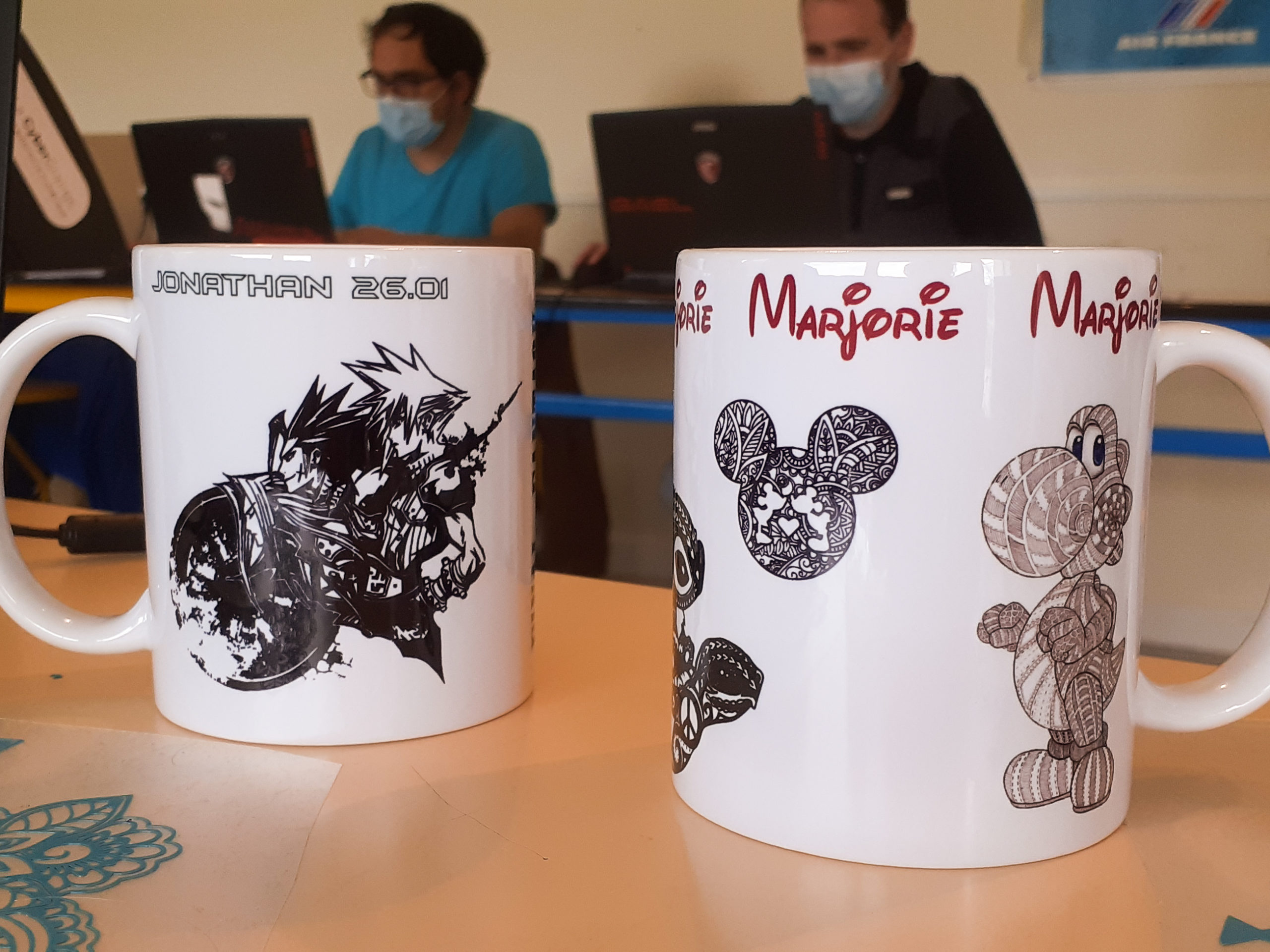 - Sublimation de tasses – Technique où l’on transfert de l’encre à sublimation sur une surface polyester (ou couverte d’une fine couche de polyester, comme les tasses) à l’aide d’une presse à chaud